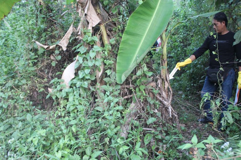 TKP berada di area kebun yang tidak terawat dengan semak belukar tinggi, menutupi pandangan dari luar. Saat ditemukan, bagian telapak kaki kiri dari jenazah tidak ditemukan di lokasi.